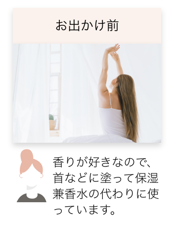 スーッと伸びてべたつかないボディミルクは、お風呂上りの濡れた肌に、就寝前に、お出か掛け前にも塗ることで、お肌に保湿を心身にはリラックスを!ぜひお楽しみください。