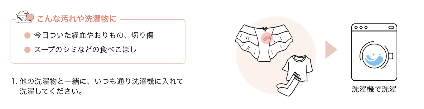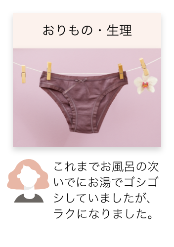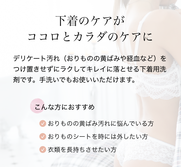 おりものは、膣をキレイにしてくれる女性の味方です。しかし、放っておくことが黄ばみの原因になってしまいます。見える汚れだけでなく、見えない黄ばみもしっかり落とすために毎日(365days)、ラクに下着のケアをお手伝いします。