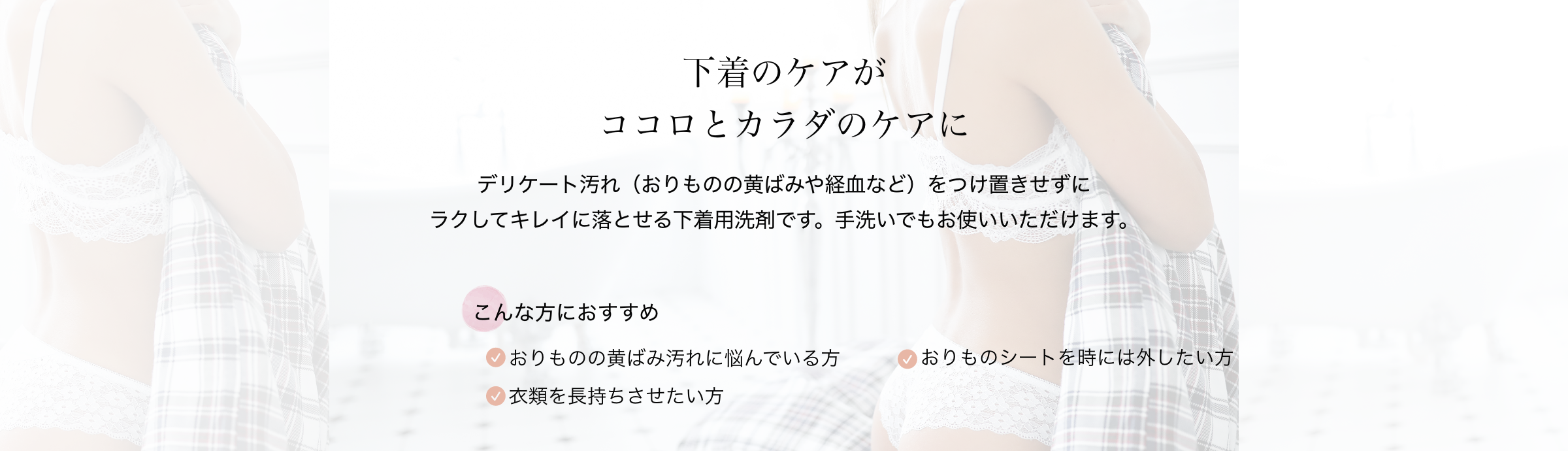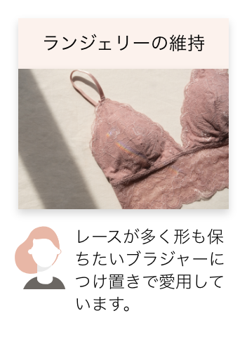 365日悩める毎日頑張っている女性のために、開発しました。おりものシートが手放せない、ついた黄ばみは漂白剤で洗っているという女性スタッフの体験のもと、大切にしている下着は長持ちさせながらもっと手軽にお洗濯できないかという思いがきっかけです。試作回数は18回に及び、肌にやさしくあることは前提で、忙しい時でも使いやすく、洗う手間を抑え、大事な衣類を重宝させるという点に集中して誕生しました。