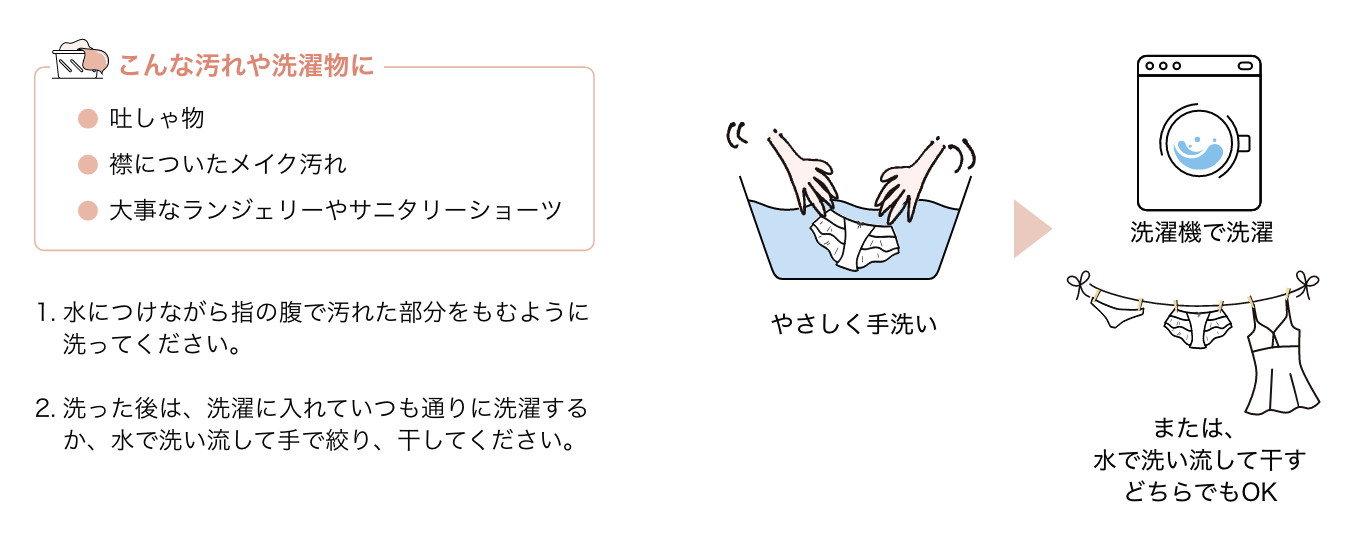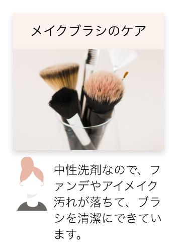 毎日のおりものや生理の経血を、つけ置き洗いなしでスッキリ・キレイに落とすランジェリーソープです。中性洗剤の万能さは、ブラジャーはもちろん、メイクブラシに付いた化粧汚れ、衣類についた食べこぼしにも活用できます。