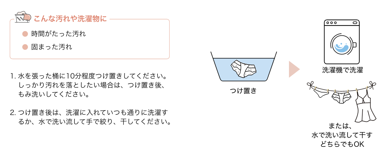 時間がたった汚れにもお使いいただけます。その際は、洗剤を直接塗布して、一度しっかり洗剤を汚れ部分に馴染ませ、軽くもみ洗いをしてください。その後、つけ置き洗いを長めにつけ、さらにもみ洗いしていただくことがオススメです。